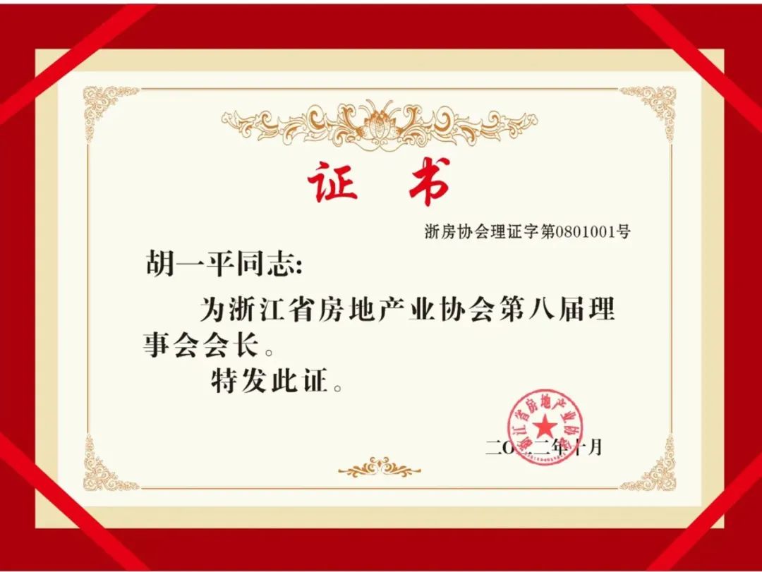 根据省民政厅和《浙江省房地产业协会章程》等有关规定要求,经浙江省房地产业协会第八次会员代表大会换届选举表决通过:德信控股集团董事长胡一平同志连任浙江省房地产业协会第八届理事会会长一职。